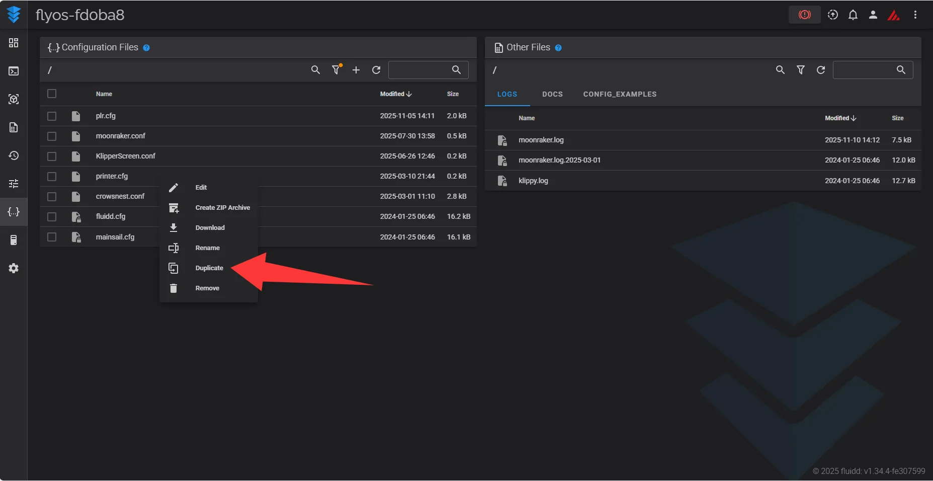 右键点击 printer.cfg 文件,选择 Duplicate 进行复制,并将副本重命名为: