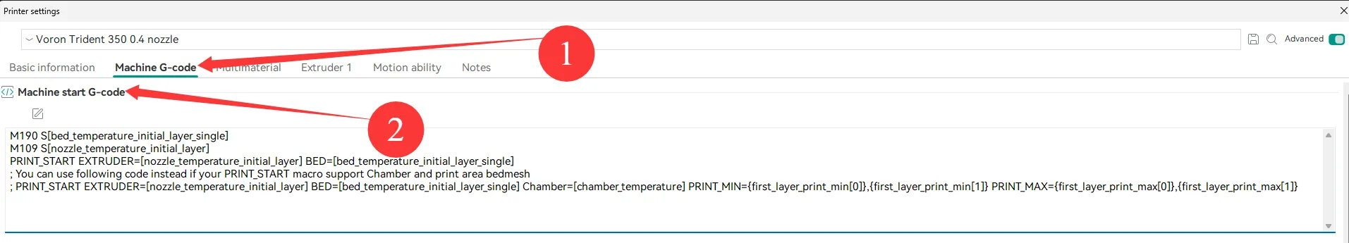 PRINT_STARTcomme macro de démarrage de l'impression, permet de personnaliser les actions à effectuer avant l'impression - Veuillez noter que le nom de la macro peut être personnalisé tant qu'il est référencé dans le code de démarrage de la tronçonneuse