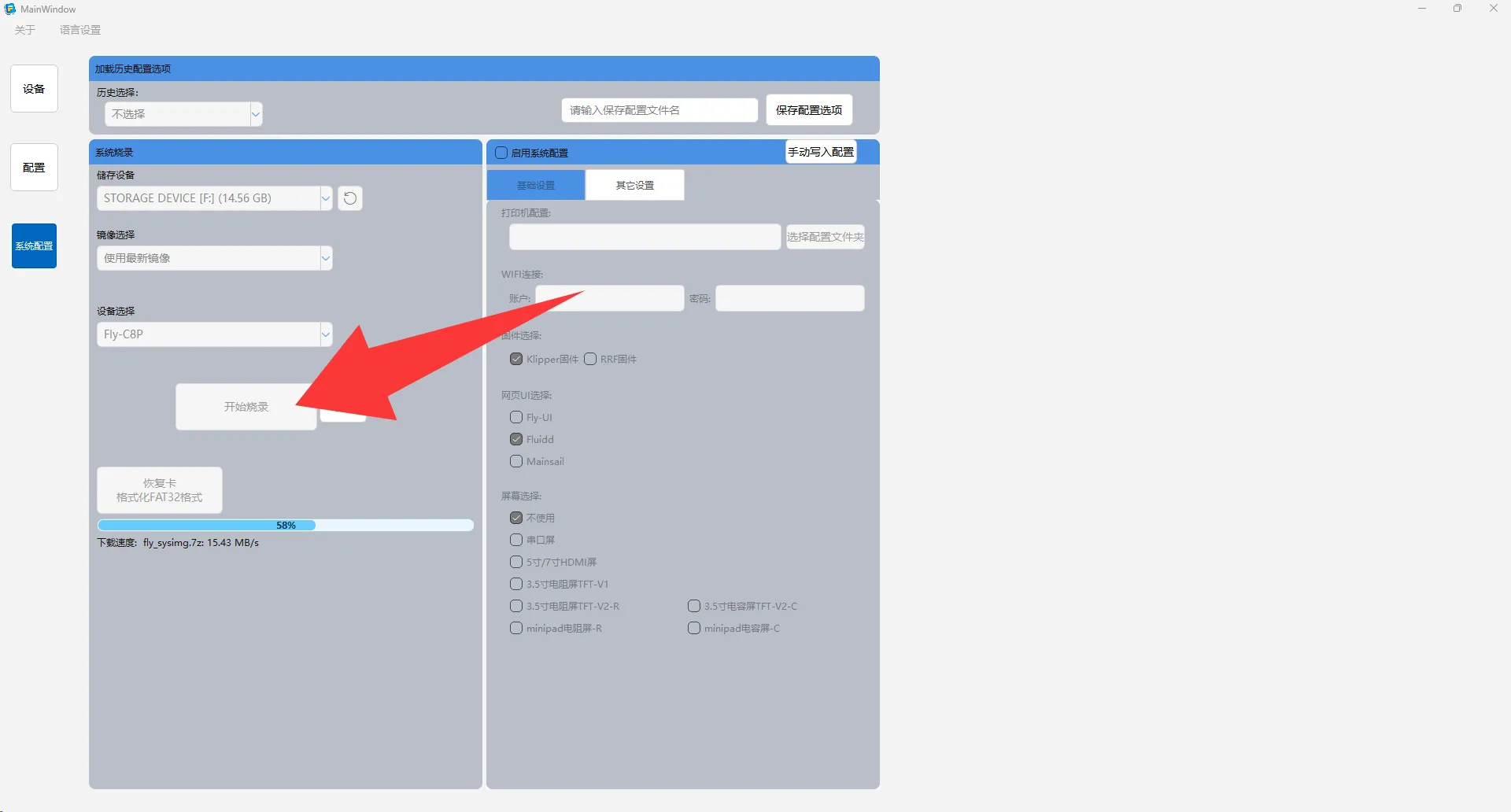 소프트웨어를 실행한 후 왼쪽 메뉴에서 시스템 설정 옵션을 선택하여 시스템 플래싱 인터페이스로 진입합니다.