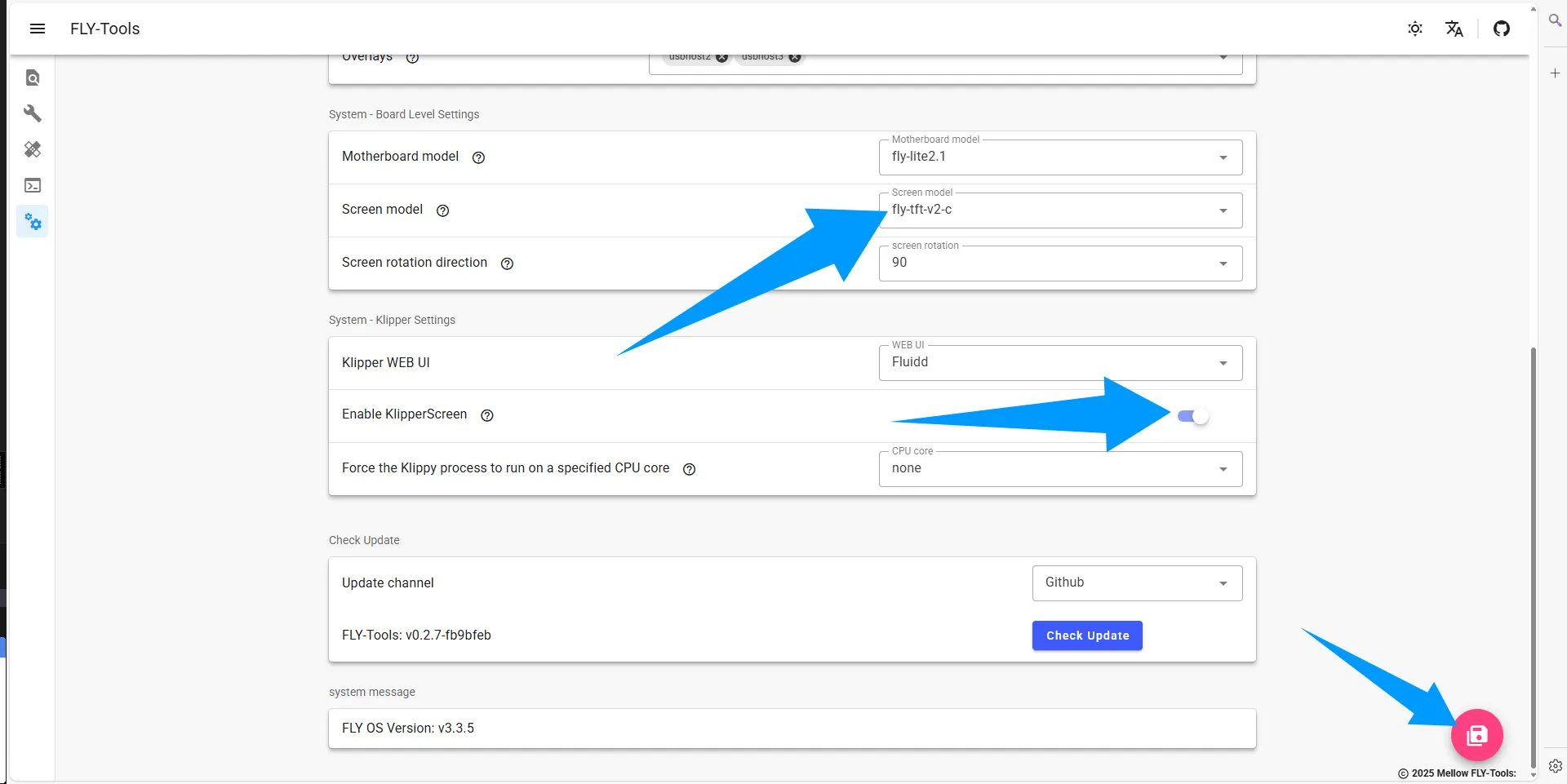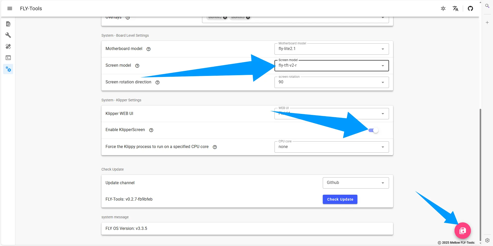 HDMI 화면설정은hdmi로 하되,=뒤에 공백이 없어야 합니다!!저항식 화면설정은fly-tft-v2-r로 하되,=뒤에 공백이 없어야 합니다!! 화면 뒷면의 스위치가Resi로 설정되었는지 확인하세요.전용식 화면설정은fly-tft-v2-c로 하되,=뒤에 공백이 없어야 합니다!! 화면 뒷면의 스위치가cap로 설정되었는지 확인하세요.klipper_screen설정은1로 하되,=뒤에 공백이 없어야 합니다!!- 참고: